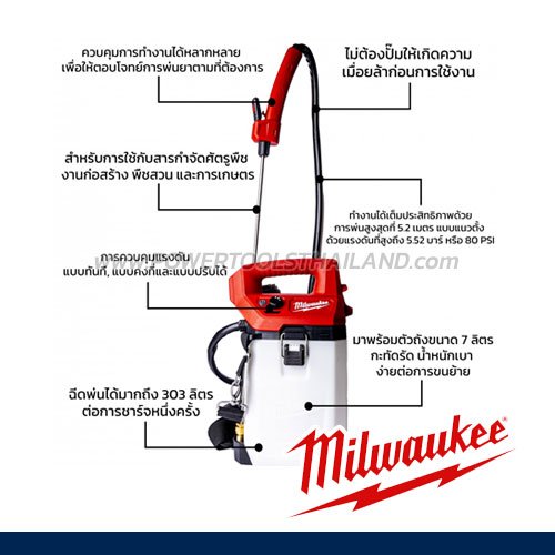 ออกแบบมาสำหรับใช้กับสารกำจัดศัตรูพืช สารกำจัดวัชพืชแบบเลือก การบำบัดพืช สารกำจัดเชื้อรา และสารกำจัดแมลง ใช้พลังงานจากแบตเตอรี่ 12V ของ Milwaukee ไม่ต้องใช้สายไฟให้ยุ่งยาก สามารถปรับแรงดันได้ 3 โหมด ให้ระยะการพ่นแนวตั้งสูงสุด 5.2 เมตร และแรงดันสูงสุด 5.52 บาร์ เครื่องพ่นยาไร้สายให้การฉีดพ่นได้มากถึง 303 ลิตร ต่อการชาร์จเพียงหนึ่งครั้ง ผลิตจากวัสดุชั้นดีที่มีความหนา แข็งแรงทนทาน และมีน้ำหนักเบา มาพร้อมตัวถังขนาด 7 ลิตร สีกึ่งใสสามารถสังเกตุระดับน้ำยาได้อย่างชัดเจน ใช้งานง่ายได้ด้วยมือเดียวหรือสองมือ สะดวกและคล่องตัวสุดๆ
